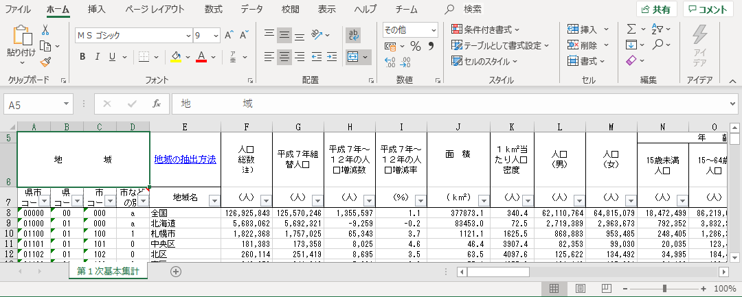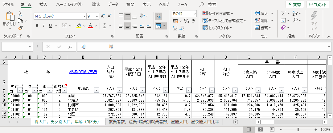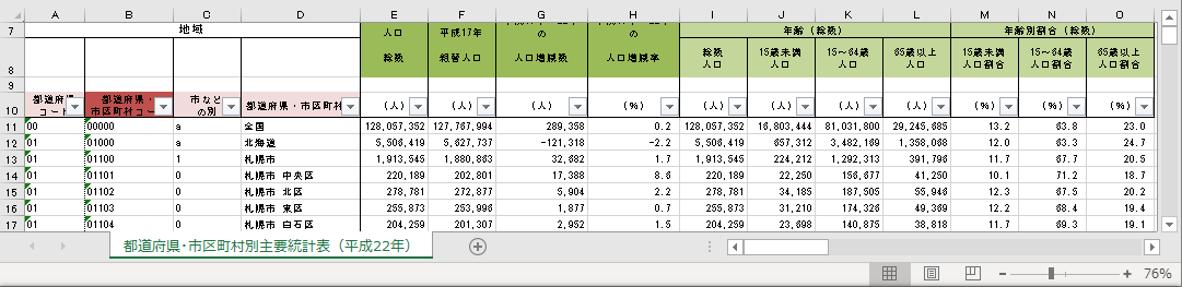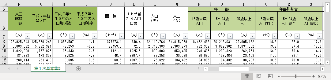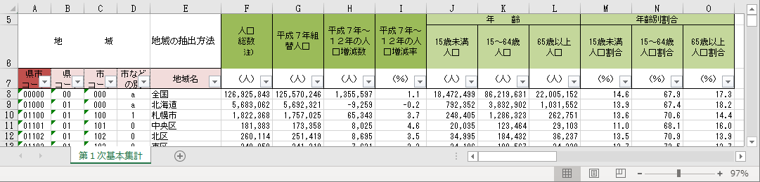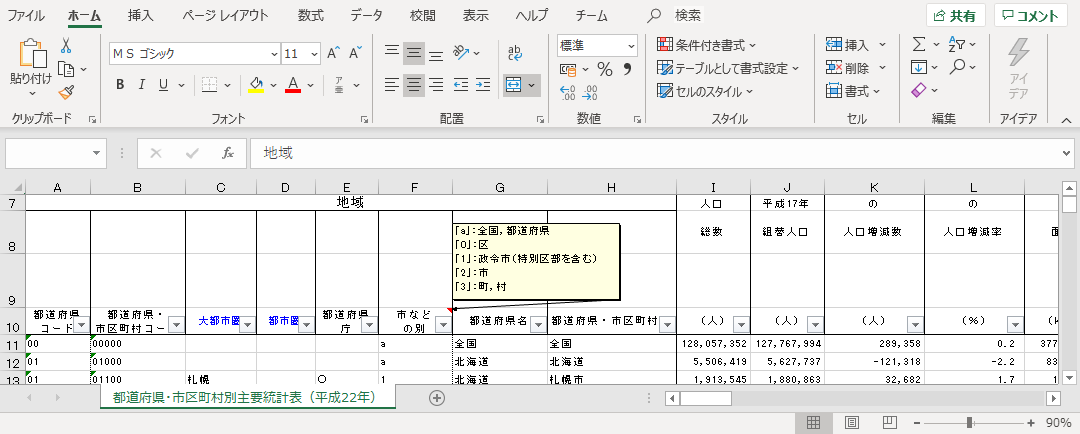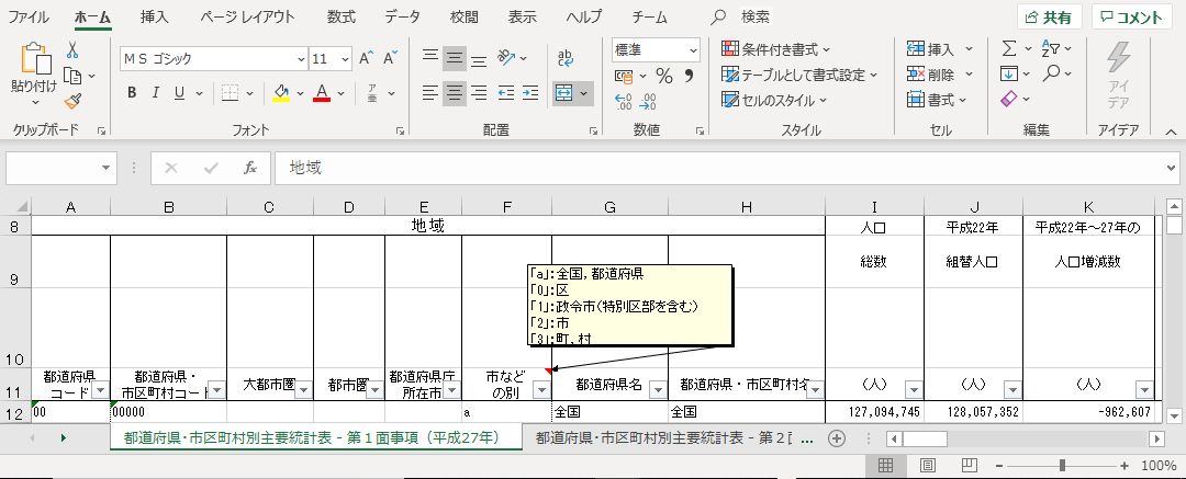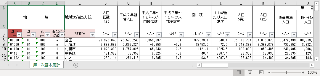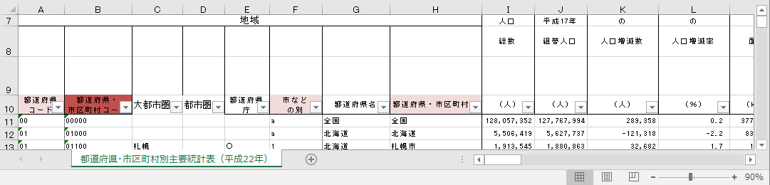 「市などの別」に 1 でフィルターをかけると 21 件が抽出される.ここまでの調査で見当がついていると思うが,このフラグは区の集合体としての市を意味しており,人口は集計行である.