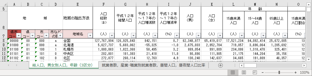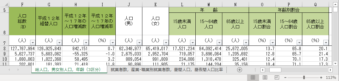 人口総数,組替人口,人口増減数,人口増減率,年齢階級別人口,年齢階級別人口割合の抽出