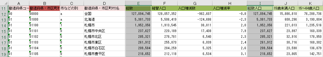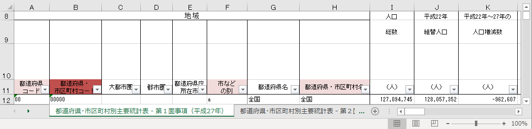 差し引きゼロで列数が同数になり,間違いに気がつかなかった.重複は削除しておこう.ついでに 2010 年版と 2015 年版の E 列のタイトルを「総数」から「人口総数」に修正しておく.2010 年版と 2015 年版は余計な文字列を削除しておく.