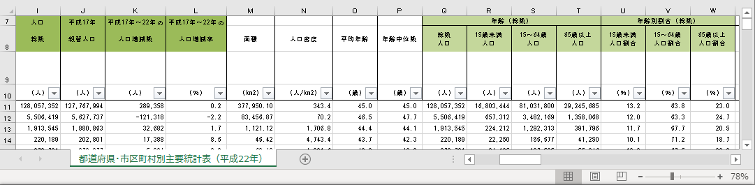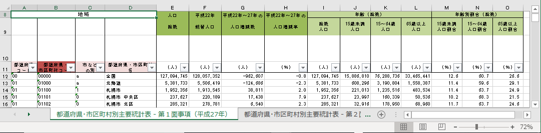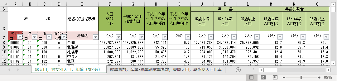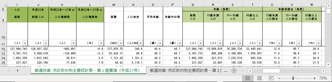 まだある.2010 年と 2015 年のファイルには「人口増減率」と「15歳未満人口」の間に「総数人口」の列があるが,2000 年と 2005 年のファイルにはない.