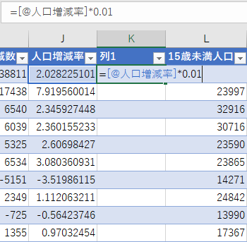 数式で=[@人口増減率]*0.01と入力する.[@Column] とは構造化参照による表記法であり,クリックだけで自動的に入力される.