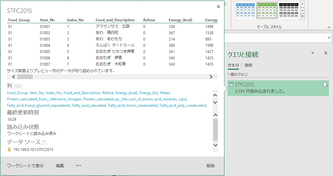 データベースを展開してテーブルをクリックすると右側のパネルにテーブルのプレビューが表示される.ここまで来て「読み込み」をクリックすると実際に接続され,データベースから EXCEL 側にデータが抽出される.