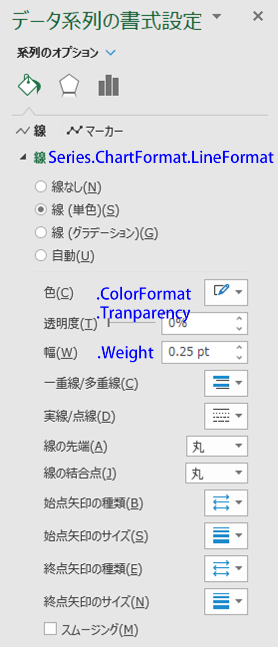 点の次に変更するのはおそらく線,つまり Line オブジェクトだろう.ここへは Series オブジェクトの Format プロパティ(ChartFormat オブジェクト)から Line プロパティ(LineFormat オブジェクト)と辿ることで取得できる.