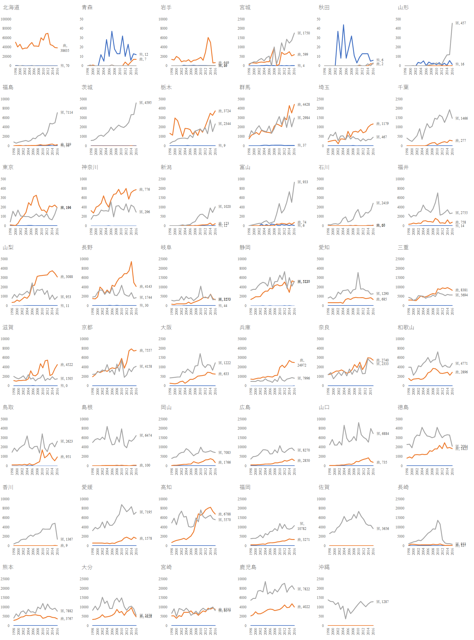 熊の他にも猪,鹿,猿などの野生動物が人の生活圏を脅かしている.野生動物の駆除が行われているところは人間と野生動物が圏域を争う最前線でもある.環境省の捕獲鳥獣数の統計をグラフにするを参考にされたい.