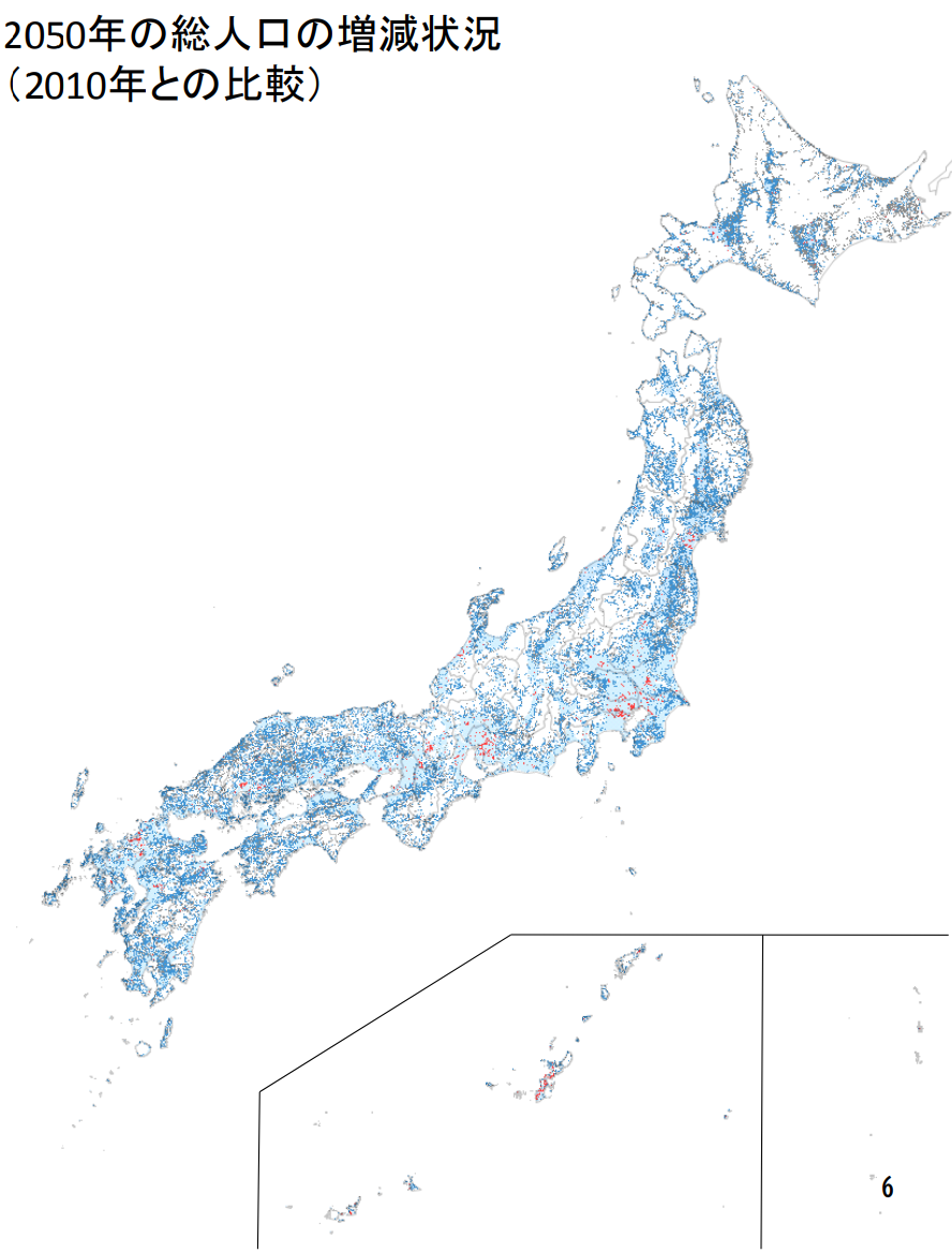 国土交通省が予測している.赤は増加,薄い青は 50 % 未満減少,濃い青は 50 % 以上減少,灰色は人がいなくなり非居住地化する地域である.